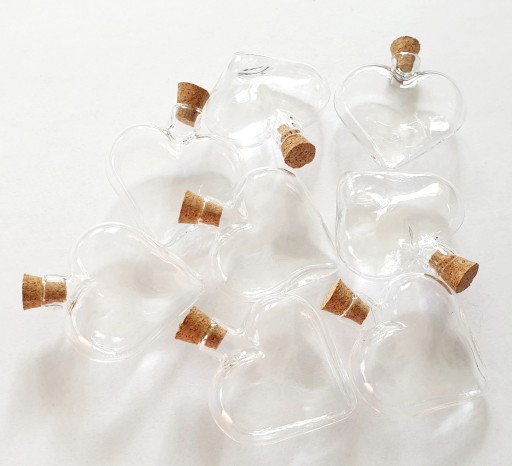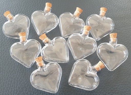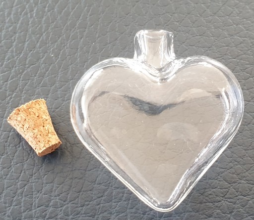 Szklana buteleczka z korkiem wykonana z przezroczystego szkła w kształcie serduszka.