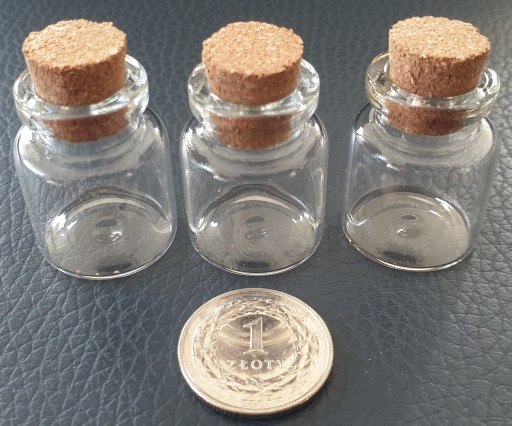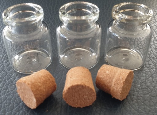 - Komplet szklanych buteleczek z korkami zapakowany w bezpieczny sposób w kartonik wypełniony folią bąbelkową.
