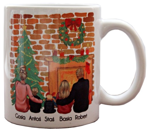 Biały kubek ozdobiony Rodziną na tle kominka.