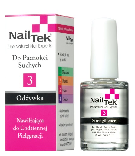 Nail Tek 3 Protection Plus – Odżywka nawilżająca do codziennej pielęgnacji paznokci suchych, w formie bezbarwnego lakieru, do stosowania zarówno na, jak i pod lakier kolorowy. Stosowana codziennie pielęgnuje paznokcie, a także nabłyszcza i zabezpiecza lakier kolorowy.