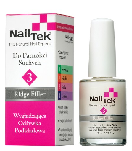 Nail Tek 3 Ridge Filler – Nawilżająca odżywka podkładowa do paznokci suchych, z naturalnymi wypełniaczami, o mlecznobiałej barwie, do stosowania pod lakier kolorowy. Wygładza płytkę paznokcia oraz maskuje jej przebarwienia. Pozostawia paznokcie idealnie gładkie.