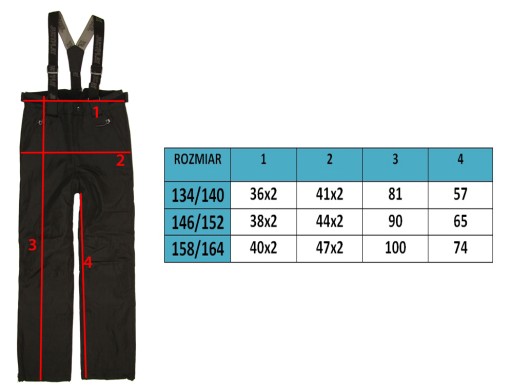 - Do spodni są dołączone elastyczne, szelki (na rzepy) z możliwością regulacji długości.