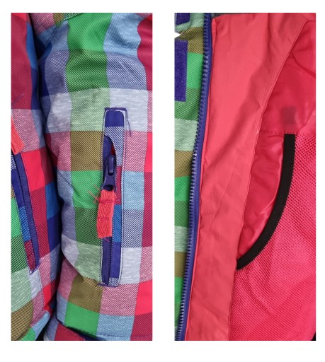 - 2 kieszenie z przodu zapinane na zamek, na rękawie dodatkowa kieszeń na skipass