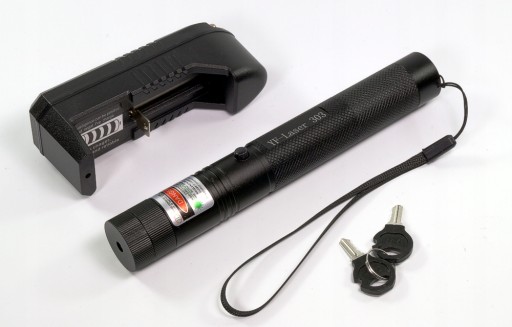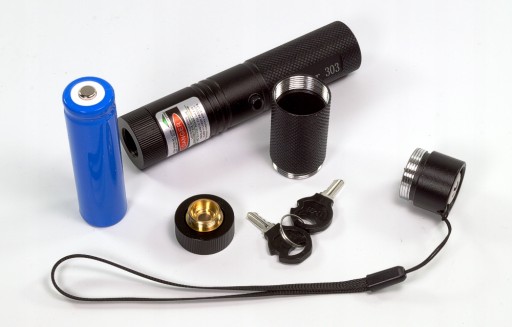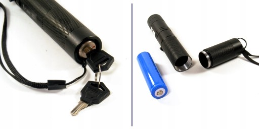W zestawie akumulator Li-ion 18650, ładowarka do akumulatora i dwa kluczyki do zabezpieczania lasera przed np. dziećmi
