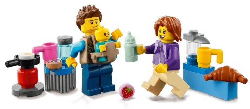 W zestawie akcesoria: nosidełko na figurkę dziecka dla minifigurek, piecyk biwakowy z patelnią i klocki udające jedzenie: smażone jajko oraz rogalik.
