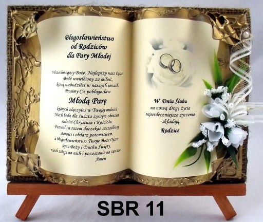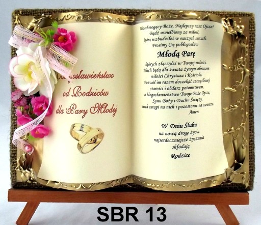 na której na głównej stronie umieszczony jest uniwersalny tekst życzeń BŁOGOSŁAWIEŃSTWA od rodziców dla Młodej Pary z okazji ślubu z piękną przestrzenną kompozycją z kwiatów materiałowych