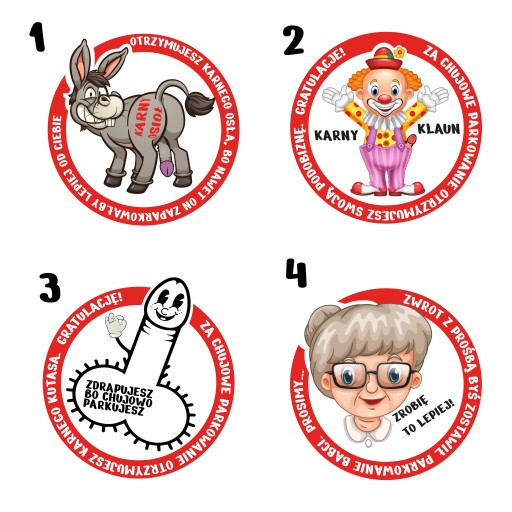 KARNE NAKLEJKI ZA ZŁE PARKOWANIE 4 RÓŻNE WZORY