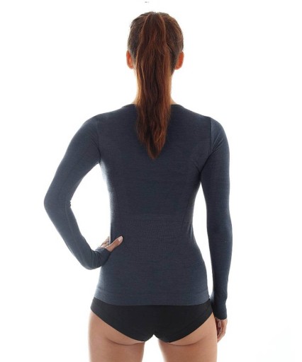 Damska koszulka z długim rękawem, wykonana została z połączenia mikrowłókien i wełny merynosów australijskich dzięki czemu jest delikatna i miła w dotyku. Otuli Twoje ciało, dając poczucie komfortu i luksusu. Konstrukcja dwuwarstwowej dzianiny pozwala na szybki odbiór wilgoci wytworzonej w trakcie codziennych czynności, dając poczucie świeżości przez długi czas. Naturalnymi właściwościami wełny merino jest antybakteryjność. Wełna nie uczula i nada się idealnie dla najdelikatniejszej skóry. Nie przejmuje nieprzyjemnych zapachów, nawet gdy masz przed sobą stresujący i pracowity dzień. Bezszwowe wykończenie nie powoduje otarć i podrażnień, niezależnie od wykonywanych czynności. Idealnie dopasuje się do kształtu Twojej sylwetki podkreślając Twoją kobiecość.