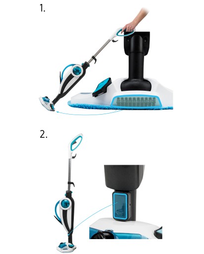 | 2w1 mop parowy i ręczna myjka parowa | Moc 2100W | 15-sekundowe nagrzewanie | 25 minut ciągłej pracy | Sucha podłoga w 3 minuty | Zbiornik na detergent | Obrotowa stopa 180° | Wymienny filtr na wodę | Duży zasięg pracy | Specjalne nakładki do różnych powierzchni | 3 nakładki materiałowe | Wbudowana szczotka | Certyfikat CE |