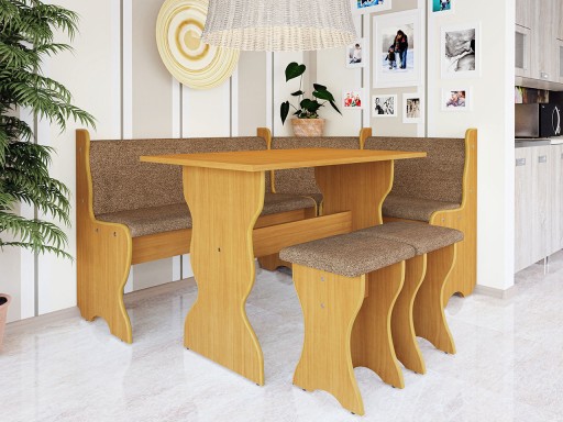 Tradycyjne aranżacje ze stolikiem i czterema krzesłami pośrodku kuchni to już przeżytek. Jeśli chce się być zawsze na czasie, należy poszukać innych rozwiązań. Dlatego najlepszym pomysłem będzie narożnik kuchenny w zestawie ze stołem oraz taboretami. Doskonale sprawdzi się, gdy kształt naszego pomieszczenia jest trudny w zaaranżowaniu, a nasza rodzina jest dość liczna. Dzięki niemu zapewnisz dosłownie każdemu domownikowi wygodne miejsce podczas spożywania posiłków, gry w planszówki, czy spotkań z przyjaciółmi. Narożnik kuchenny został wyposażony w dwa poręczne schowki pod siedziskami, w których miejsce swe znajdą drobne i niezbędne przedmioty codziennego użytku. Stół, który wchodzi w skład zestawu, nie jest rozkładany. Jest lekki, poręczny i praktyczny. Elementami dopełniającymi zestaw są taborety, które możesz dowolnie przestawiać i ustawiać według własnych upodobań. Są wygodne i bardzo wytrzymałe.
