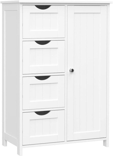 Funkcjonalna szafka - regał z czterema szufladami, doskonale sprawdzi się w łazience, w przedpokoju do przechowywania toreb, szalików, ozdób, kluczy itp., a także w sypialni czy garderobie.