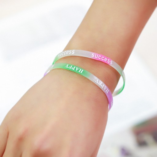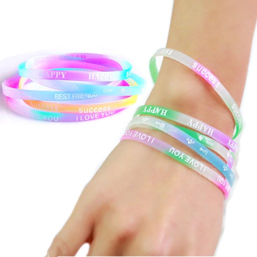 Wielokolorowa w cukierkowej tonacji. Bransoletki mają inspirujące, optymistyczne na napisy jak na zdjęciach: SUCCES, HAPPY, BEST FRIENDS, I LOVE YOU.