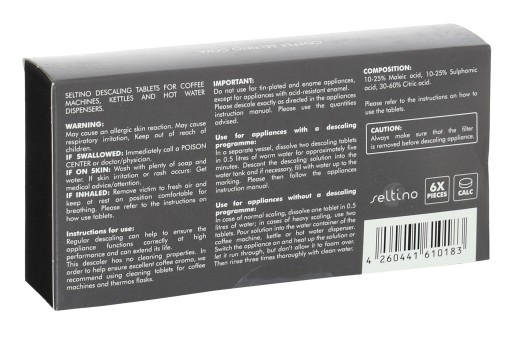 Regularne odkamienianie pomaga utrzymać twoje urządzenie w najlepszej kondycji. Tabletki odkamieniające nie mają właściwości czyszczących. Dla uzyskania doskonałego smaku kawy zaleca się użyć również tabletek czyszczących Seltino Clean lub tabletek rekomendowanych przez producenta ekspresu.