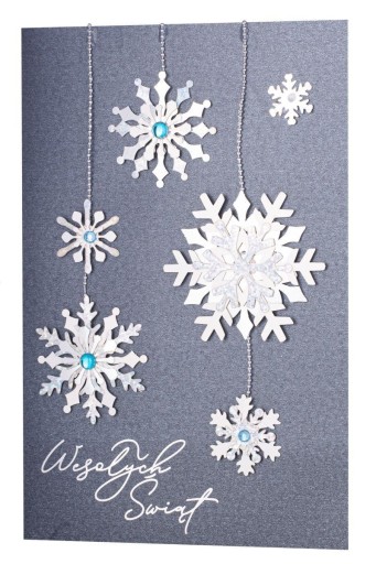 Oferowana kartka na Bożonarodzeniowa jest bardzo elegancka i bogato zdobiona.