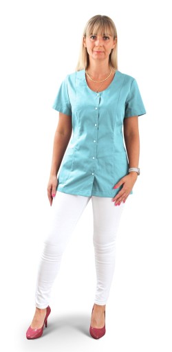 Fartuch damski bez kołnierzyka z dekoltem na okrągło, posiada dwie kieszenie.