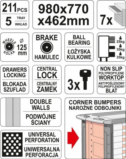 - 5 górnych szuflad zawiera 211 starannie dobranych narzędzi