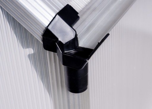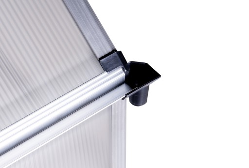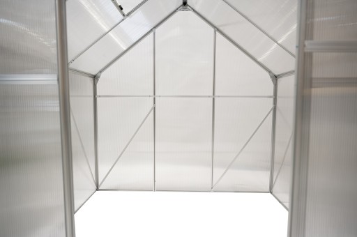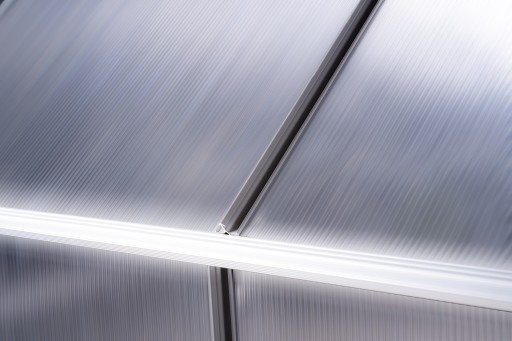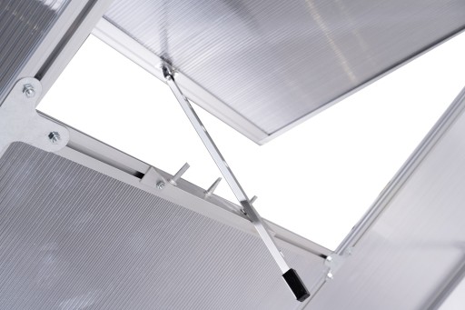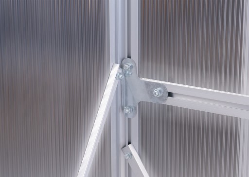 Profil wykonany jest z aluminium i szyb poliwęglanowych – dzięki czemu konstrukcja jest lekka i wytrzymała. Szklarnia wyposażona jest w okna dachowe z regulacją wysokości co sprzyja zachowaniu prawidłowej cyrkulacji powietrza . Ponadto szklarnia posiada przesuwne drzwi na rolkach oraz rynny odprowadzające wodę.
