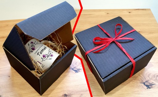 W formularzu pozakupowym Allegro dostępna jest opcja ozdobnego pakowania kubeczka w czarny kartonik sianko i elegancką ozdobną czerwoną rafię.