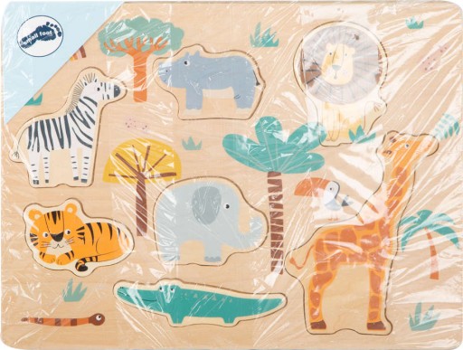 Zestaw składa się z pięknej ramki i różnych figurek zwierzątek, kształt których trzeba dopasować do ramki żeby ułożyć cały obrazek. Zestaw w całości wykonany z drewna.