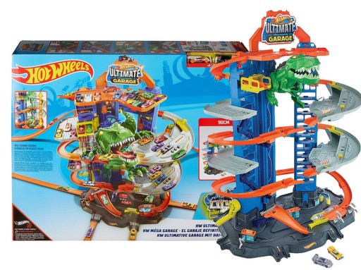 Ten ogromny wielopoziomowy zestaw do zabawy może pomieścić ponad 100 samochodzików w skali 1:64, a atakujący znienacka T-rex pobudza wyobraźnię! Mega Garaż T-Rexa łączy się z innymi zestawami do zabawy Hot Wheels® (sprzedawane oddzielnie) i zawiera 2 pojazdy Hot Wheels® w skali 1:64.