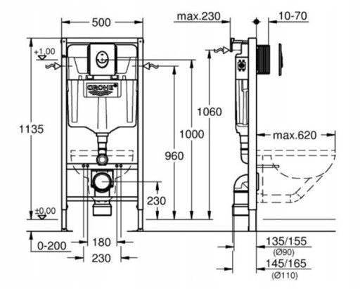 Скрытый унитаз КОМПЛЕКТ GROHE FRAME + чаша Rimelss