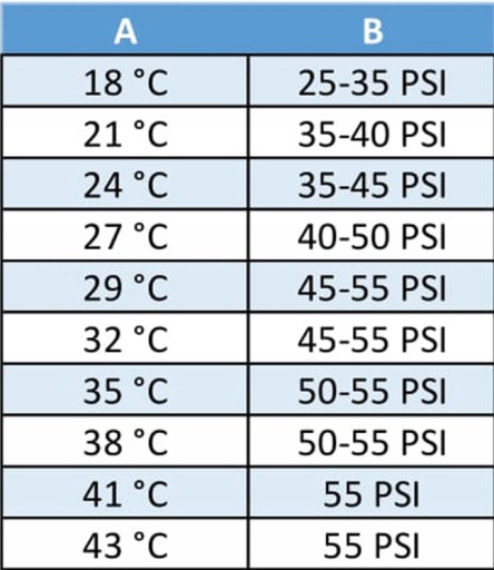 3.Po włączeniu sprężarki kontynuuj napełnianie, aż ciśnienie osiągnie wartość 25-55 PSI. Jaka dokładnie wyjaśniamy w tabeli poniżej.