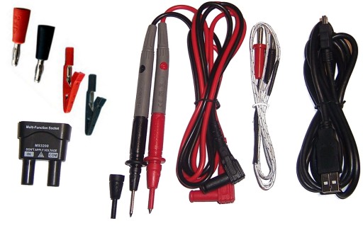 w zestawie : miernik uniwersalny Forscher FS8218 , futerał ,silikonowe przewody pomiarowe (komplet) , sonda temperatury ,