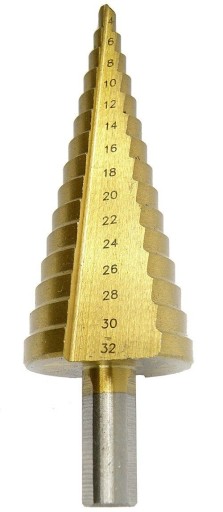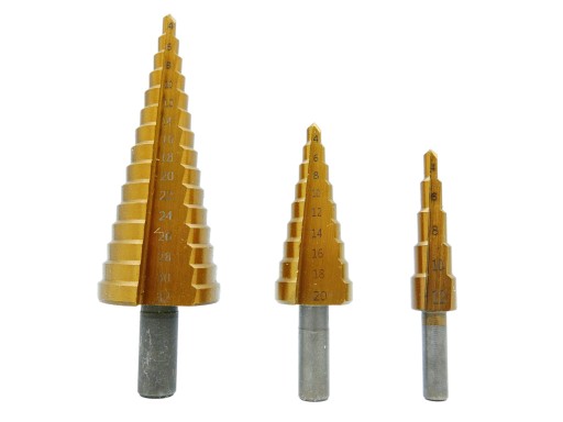 Wiertła stopniowe stożkowe, wykonane z wysokogatunkowej stali szybkotnącej HSS + TYTAN. Przeznaczone do metali , blach stalowych cienkościennych, tworzyw sztucznych.