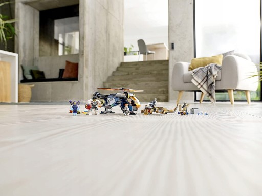- Zestaw zawiera 4 minifigurki, odlotową figurkę Hulka, helikopter z potrójnymi miotaczami klocków i możliwością zrzucenia Hulka w wir walki, a także lewiatana i miotający klocki latający pojazd Chitauri do rozgrywania epickich starć w powietrzu.