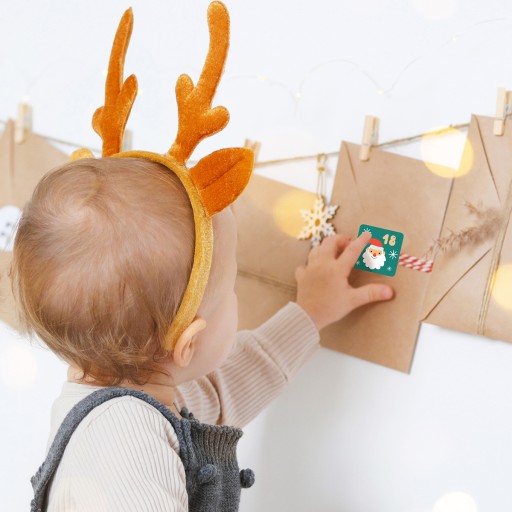 Zestaw nie zawiera torebek, klamerek itp. tylko arkusz naklejek. Na zdjęciach przedstawiona jest propozycja stworzenia kalendarza adwentowego. Do kompletu można również u nas zakupić drewnianą bazę do kalendarza personalizowaną imieniem dziecka.