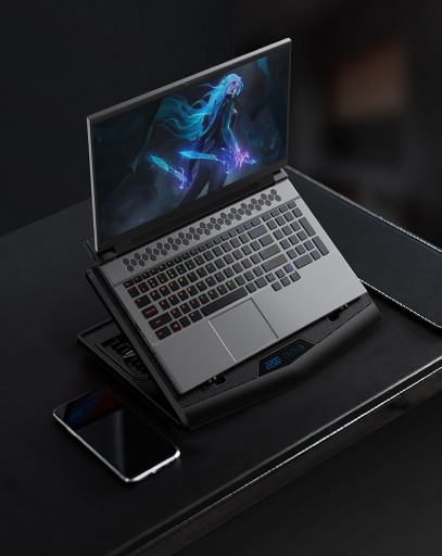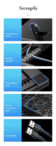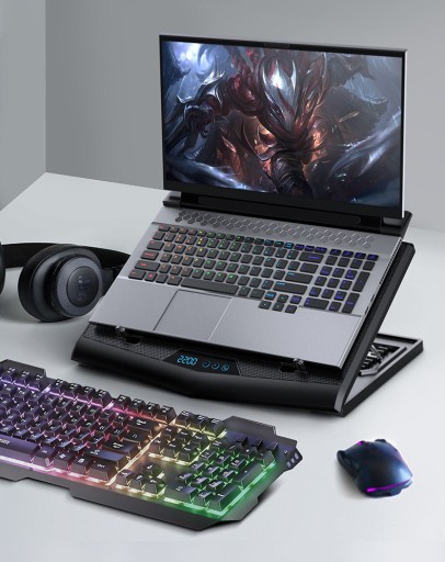 Podstawka pod laptopa to przede wszystkim nowoczesny wygląd, stabilna konstrukcja oraz wydajny system wentylatorów z możliwością regulacji obrotów. Rozmieszczenie wentylatorów zapewnia doskonałe i efektywne chłodzenie laptopa bez względu na umiejscowienie nagrzewających się podzespołów notebooka (procesor, karta graficzna, układy zasilania, dyski twarde). Szeroka kompatybilność z laptopami i notebook'ami o różnych wielkościach matryc 10,12,13,14,15.6, 16, 17". Konstrukcja umożliwia korzystanie z podstawki na kolanach. Hydrauliczne łożyska pracują bardzo cicho. Przy ustawieniu najniższych obrotów wentylatorów hałas jest praktycznie niesłyszalny. Dolna część podstawy posiada dodatkowe nóżki zwiększające kąta nachylenia, tak aby zapewnić jak największą ergonomię pracy.