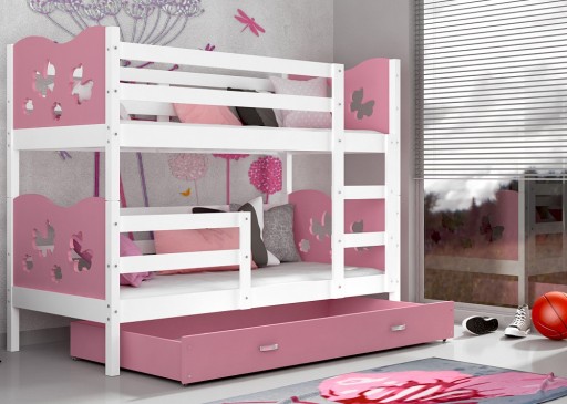 Łóżko piętrowe DAX 200x90 zostało stworzone dla rodzeństwa. Oryginalny wzór na wstawkach dodaje uroku łóżka. Stabilna konstrukcja gwarantuje bezpieczne użytkowanie z mebla. Dodatkowym autem jest pojemnik na pościel oferując dodatkową powierzchnię użytkową. Łóżko zostało pomalowane ekologicznymi farbami, które są bezpiecznie dla dzieci. W zestawie znajduję się materac piankowy oraz stelaż typu FLEX.