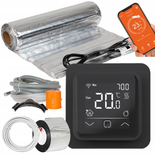 Kompletny zestaw elektrycznego ogrzewania podłogowego firmy THERMOVAL. Nowoczesny programowalny regulator temperatury z podłogowym regulatorem temperatury oraz z możliwością zdalnego sterowania za pomocą telefonu lub tabletu z systemem Android lub iOS. Jednostronnie zasilana, samoprzylepna mata grzejna oraz ułatwiające montaż akcesoria.