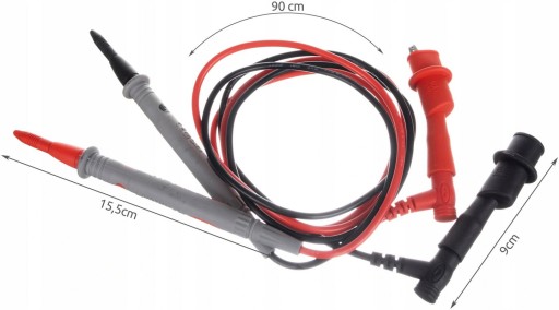 - SPECYFIKACJA – materiał: PCV/ silikon; prąd 10 A; długość całkowita: 107 cm; długość kabla: 90 cm; testowania komponentów IC; kompatybilny z uniwersalnymi miernikami cęgowymi; ostry koniec styku; silikonowy uchwyt; oznaczenie kabla: czerwony – pozytywny, czarny – negatywny; CAT II 1000 V; 10 A; waga: 0,090kg