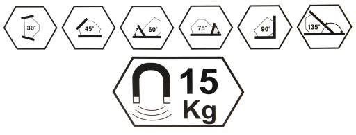 Pozwala na szybkie łączenie elementów spawanych pod sześcioma różnymi kątami: 30°, 45°, 60°,75°, 90°, 135°.