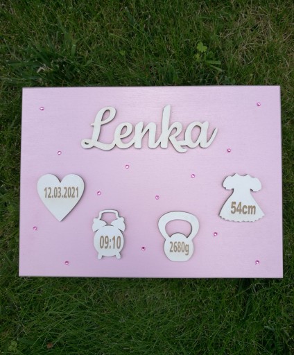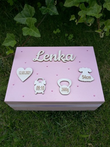 - kolor pudełka jasny róż, imię w kolorze białym, dekoracje białe z wygrawerowanymi danymi.