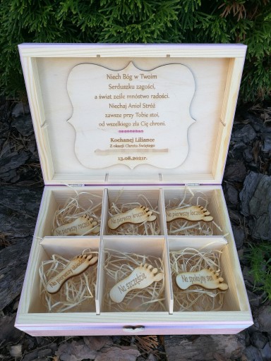 Pudełeczko wewnątrz na wieczku ma zamieszczoną tabliczkę z życzeniami, dedykacją i datą Chrztu Św/urodzin.