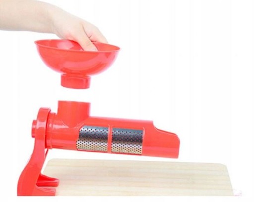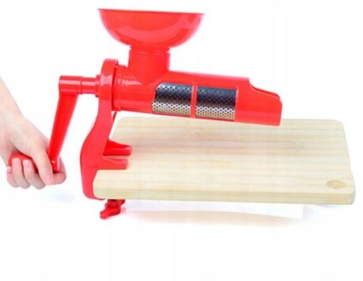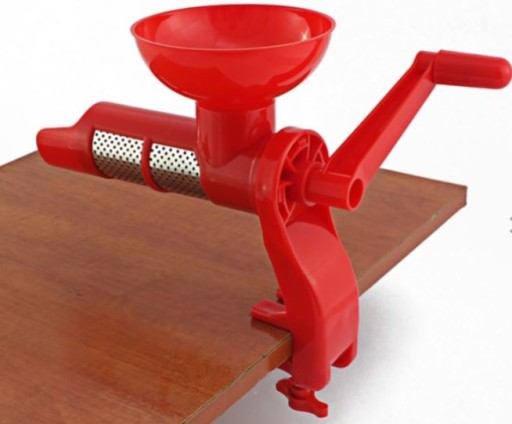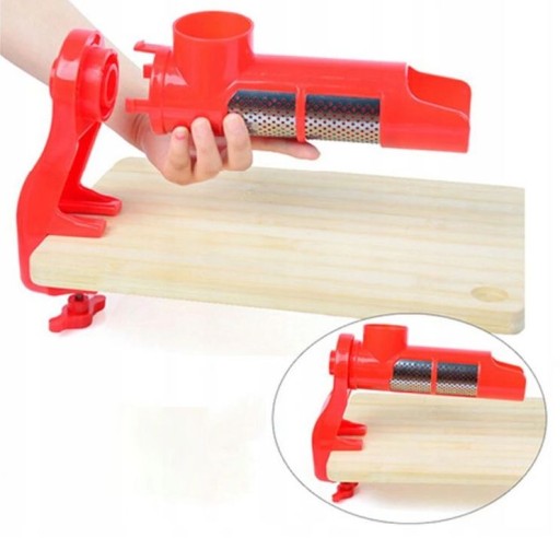 Ręczna maszynka do przecierania pomidorów, ze stali nierdzewnej, prosta w obsłudze, czerwona, do blatów różnej grubości.