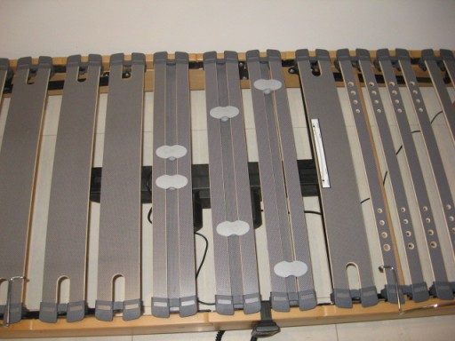 Stelaż w najbogatszej wersji - listwy z okleiną i super elastyczna strefa na wysokości ramion. Standardowo jest wyposażony w pilot przewodowy a za dopłatą pilot bezprzewodowy który posiada podświetlane przyciski i wbudowaną latarkę.
