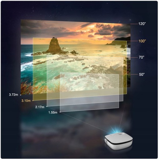 Rzutnik pozwala wyświetlać obrazy o przekątnej aż do 120 cali. Dzięki możliwości dopasowania ostrości i korekcji zniekształcenia trapezowego , wyświetlany rzut jest idealnie prostokątny i dopasowany do Twoich potrzeb. Spraw sobie kinowe doświadczenia w domowym zaciszu !