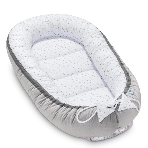 Kokon z kolekcji GREY GALAXY chroni przed twardymi szczebelkami łóżeczka, a w łóżku rodziców zapewni bezpieczne miejsce podczas wspólnego spania z Mamą i Tatą – zabezpiecza przed podduszeniem czy zgnieceniem. Wysokie miękkie boki gniazdka ułatwiają ułożenie maluszka na boku, co jest istotne przy ulewaniu się u niemowląt.