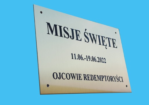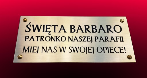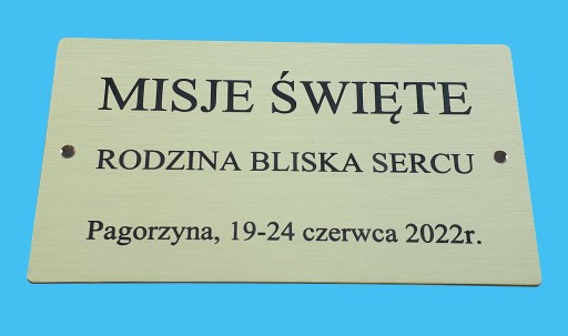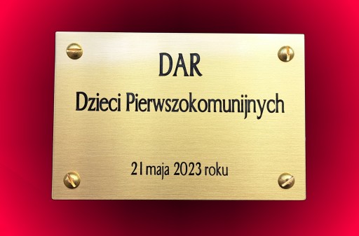 Tabliczka wykonana z mosiądzu grawerskiego szczotkowanego (kolor złoty) fabrycznie zabezpieczona lakierem bezbarwnym do zastosowań wewnętrznych i zewnętrznych. Grawer wykonany techniką graweru wklęsłego, grawer patynowany na kolor czarny. Wymiary tabliczki 200 x 100 mm. Tabliczka posiada dwustronną bardzo mocną taśmę piankową do montażu na zewnątrz. Na życzenia klienta wykonuję otwory do przykręcenia za pomocą mosiężnych wkrętów (wkręty w cenie tabliczki). Istnieje możliwość wykonania tabliczek o innych wymiarach, wtedy cena ustalana jest indywidualnie.