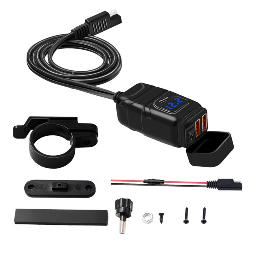 Ładowarka motocyklowa 2x QC3.0 + WOLTOMIERZ+ PRZYCISK: