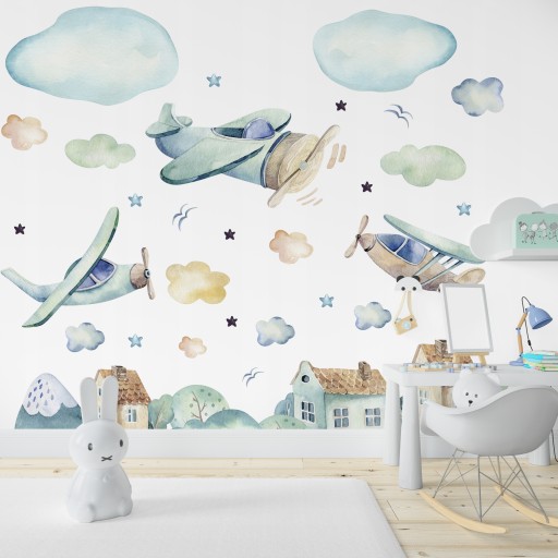 Z pomocą naklejki Samoloty i domki udekorujesz każdą ścianę, a także inną dowolnie wybraną, gładką powierzchnię.
