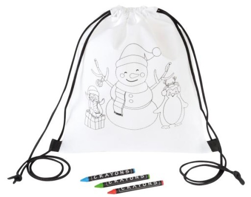 Plecak do kolorowania COLOURFUL SNOWMAN z nadrukowanym motywem świątecznym i 3 kredki woskowymi przeznaczonymi do kolorowania.