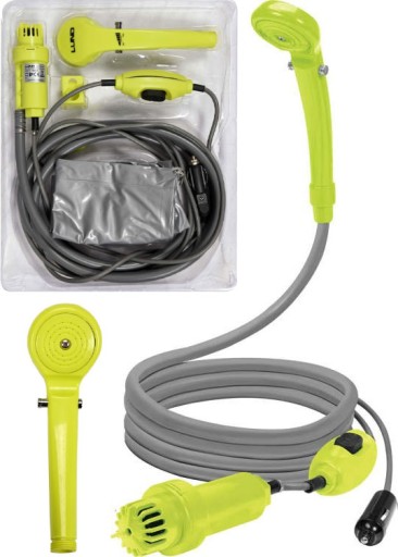 Przenośny prysznic wyposażony w elektryczną pompkę. Przydatny na kempingach, biwakach oraz w miejscach bez dostępu do łazienki. Wąż o długości 2 metrów oraz przewód zasilający o długości 4 m zapewnią duży zasięg pracy.