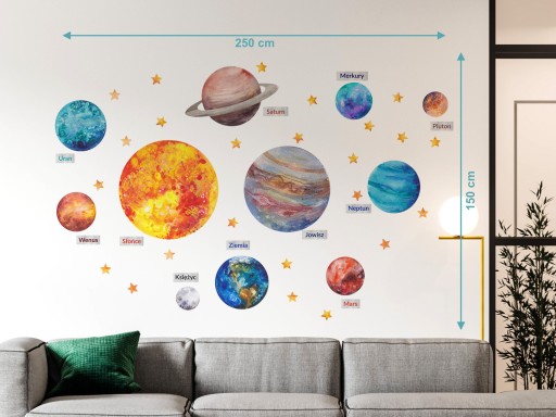 - Naklejki naklejone na ścianę jak na wizualizacji zajmują powierzchnię 250 cm x 150 cm