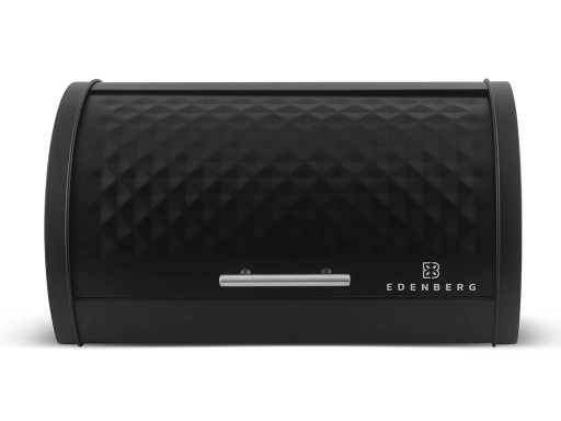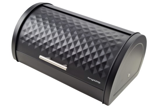Chlebak stalowy, kolor czarny, wykończenie mat. Otwierany z przodu (pokrywa tak zwana diament), nie trzeba dodatkowego miejsca do otwierania chlebaka.