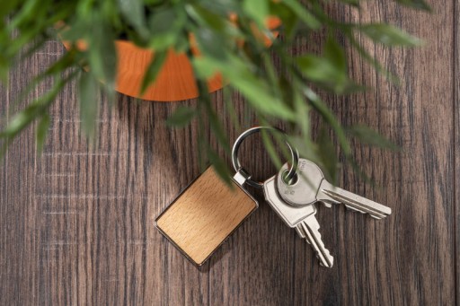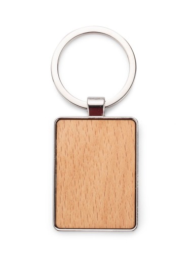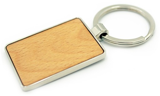 Brelok w kształcie domku lub prostokąt, wykonany jest ze stopu cynku i drewna. Jest lekki i wygodny w użyciu. Drewniany brelok prezentuje się bardzo oryginalnie, a w połączeniu z metalem zyskuje elegancję. Pakowany w brązową, papierową kopertę