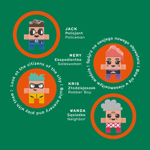 Zwykle spokojne skrzyżowanie miasteczka dzisiaj tętni życiem. Wszystko za sprawą złodziejaszka Krisa, który mknie swoim autem przez ulicę, nie zważając na światła. Ekspedientka Mary wzywa na pomoc policjanta Jacka, a ten natychmiast rzuca się w pościg. Całej sytuacji przygląda się niepozorna sąsiadka Wanda, która wydaje się znać tajemnicę tej zuchwałej kradzieży… Tchnij życie w ruchliwe skrzyżowanie miasteczka! Zbuduj sklepik ekspedientki Mary, rozmieść sygnalizację świetlną i skonstruuj auto, którym porusza się złodziejaszek Kris. Do Waszej dyspozycji oddajemy aż 280 klocków i 4 niepowtarzalne figurki – możesz składać zestaw zgodnie z instrukcją lub dać porwać się wyobraźni i budować konstrukcje, które nie śniły się profesjonalnym architektom. Bawcie się wspólnie rozwijając wyobraźnię – zarówno przestrzenną, jak i tę związaną z wymyślaniem i opowiadaniem historii. Pobudź dziecięcą kreatywność i daj ponieść się nieskrępowanej sile fantazji. Kto wie, być może skrzyżowanie zamieni się w drapacz chmur? W naszym miasteczku jedyną granicą jest wyobraźnia! Bohaterowie zestawu: Kris – złodziejaszek, potrafi poruszać się bezszelestnie i nie ma na świecie miejsca, do którego nie mógłby się dostać. Do tej pory był nieuchwytny, ale może w końcu się to zmieni… Jack – policjant, który czuwa nad spokojem obywateli miasteczka. Sen z powiek spędza mu nieokiełznany złodziejaszek Kris, ale jak sam mówi, w końcu go dorwie! Mary – ekspedientka prowadząca ulubiony sklepik mieszkańców miasteczka. Czy tym razem to ona padnie ofiarą Krisa i straci swoje rogaliki? Wanda – sąsiadka, która widzi i słyszy wszystko, choć nie zawsze daje to po sobie poznać. Zna wszystkie sekrety miasteczka i jego obywateli. Być może nawet wie, gdzie ukrywa się złodziejaszek Kris. Zalety zestawu:Rozwija wyobraźnię i kreatywność poprzez wspólną zabawę Instrukcja, jakiej jeszcze nie było! W 100% bezpieczne materiały – certyfikowane i łatwe do czyszczenia pod bieżącą wodą Atrakcyjna, wielogodzinna zabawa nie tylko dla dzieci! Konstruuj kształty w 2D i 3D Specyfikacja zestawu: Aż 280 elementów! 4 figurki w zestawie Instrukcja budowania krok po kroku (56 stron) Innowacyjne kształty klocków Wiele dodatkowych klocków o specjalnym przeznaczeniu z nadrukami Klocki wyprodukowane w Polsce Klocki i opakowania wytworzone z materiałów odnawialnych w recyklingu W zestawie znajdziesz 35 elementów.Rozmiar opakowania: 19,5 cm x 12,5 cm x 17,5 cm Wiek: 3-103Ostrzeżenie: Zabawka nieodpowiednia dla dzieci poniżej 36 miesięcy. Zawiera małe elementy, łatwe do połknięcia. Ten produkt spełnia europejskie standardy. Usuń elementy opakowania przed podaniem zabawki dziecku. Zachowaj etykietę, ponieważ zawiera ważne informacje. Kolorystyka elementów może różnić się od prezentowanych na opakowaniu.